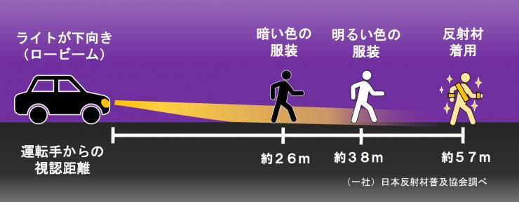 また別の観点ですが、図からは反射材を付けていれば約 57m 先から認識できるため、時速 60km で走っていても間に合うことがわかります。
